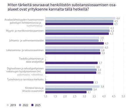 Erikoistuneempaa osaamista tarvitaan erityisesti asiakaslähtöisen palvelun kehittämiseen ja tuottamiseen, myyntiin ja markkinointiin sekä johtamiseen ja valmentamiseen. Asiakaslähtöinen palvelu sekä myynti ja markkinointi ovat pysyneet kärkikaksikossa vuodesta 2019 lähtien lähes muuttumattomina, kun taas johtamis- ja valmentamistaitojen merkitys on kasvanut hieman edellisiin selvitysvuosiin verrattuna.