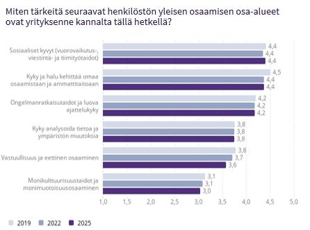 Kaupan alan yritykset korostavat osaamistarpeissa erityisesti työelämätaitoja yhdistettynä asiakaslähtöisyyteen ja myyntiin, digitalisaatioon liittyvien taitojen rinnalla. Yritysten mielestä tärkeimpiä henkilöstön yleisen osaamisen osa-alueita ovat vuorovaikutustaidot, kyky ja halu kehittää omaa osaamistaan sekä ongelmanratkaisutaidot. Nämä perusosaamiset ovat säilyttäneet paikkansa tärkeimpinä yleisinä osaamisina myös vuosina 2022 ja 2019.
