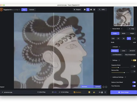 Lisää pikseleitä. Topaz Gigapixel AI on epätarkkojen kuvatiedostojen parantelija, joka laskee kuvaan lisää tarkkuutta tarvittaessa grafiikkasuorittimen avulla.