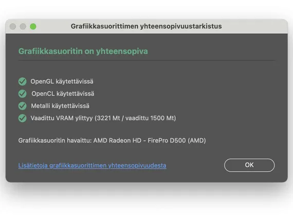 Oman näytönohjaimen tuen voi tarkistaa Photoshopissa valitsemalla Ohje > Grafiikkasuorittimen yhteensopivuus. Mikäli kaikki ruksit ovat vihreitä, asiat ovat kunnossa. Mikäli ruksien yläpuolella olevat teksti näyttää grafiikkaprosessorin olevan pois päältä, se on jostakin syystä kytketty pois asetuksista. Asian voi muuttaa valitsemalla Muokkaa > Oletusasetukset > Suorituskyky. Maceissa sama asetus löytyy Photoshop-valikosta.
