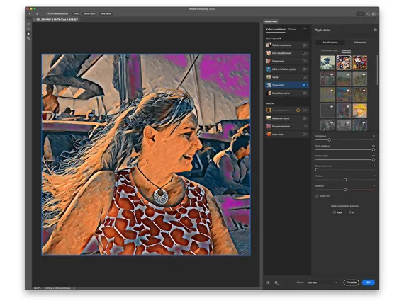 Tyyli vaihtoon. Photoshopin Neural Filters -suotimista huomattava osa käyttää hyväkseen grafiikkasuoritinta, eivätkä nämä toiminnot onnistu ilman sitä. Neural filtereillä voi esimerkiksi muuttaa valokuvan tyylin maalauksen kaltaiseksi kuten kuvassa, tasoittaa ihoa, meikata virtuaalisesti ja jopa muuttaa kasvojen ilmettä tai katseen suuntaa. Tulokset eivät toki aina ole onnistuneita.