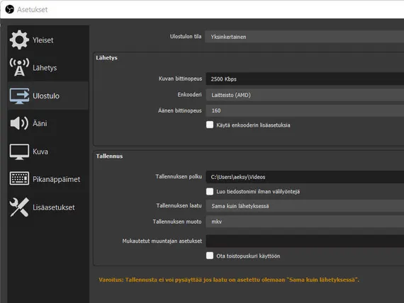 Valitse oikea enkooderi. OBS Studion videon koodauksessa kannattaa ehdottomasti käyttää näytönohjainkiihdytystä, jos se on mahdollista. Oletusarvoisesti käytetään ohjelmistopohjaista koodausta, mutta laitteistokiihdytyksen saa käyttöön asetusvalikon kohdasta Ulostulo.