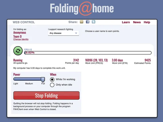 Tehot hyödyksi. Folding@Homen avulla oman tietokoneen tehot voi erittäin helposti luovuttaa tieteen käyttöön silloin, kun niitä ei itse tarvitse. Sovellus käyttää automaattisesti sekä keskus- että grafiikkasuorittimen laskentatehoa.
