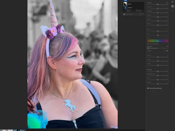 Irti taustasta. Adobe Lightroomin maskitoiminnon Select subject -tila on erinomainen esimerkki gpu-kiihdytyksestä hyötyvistä toiminnoista. Se irrottaa kuvan varsinaisen kohteen, kuten tässä Pride-juhlijan, irti taustastaan yhdellä klikkauksella. Tämän jälkeen joko kohdetta tai taustaa voi käsitellä itsenäisesti, esimerkiksi muuttaa mustavalkoiseksi. Täydellinen tulos ei aina ole: esimerkkikuvassa mallin nenän päälle on jäänyt pieni palanen taustaa, ja joissakin toisissa kuvissa pääkoriste ei tullut mukaan kokonaan. Asia on kuitenkin yleensä helppo korjata muokkaamalla maskia käsin.