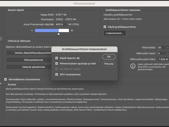 Kaikki käyttöön. Photoshopissa suorituskykyasetuksille on oma välilehtensä, jolla säädetään myös grafiikkakiihdytyksen asetuksia. Photoshop hyödyntää OpenCL-tekniikkaa.