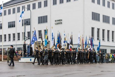 Suomenliput liehuivat paraatikatselmuksessa itsenäisen Suomen kunniaksi. Kuva: Sasu Jarnstedt