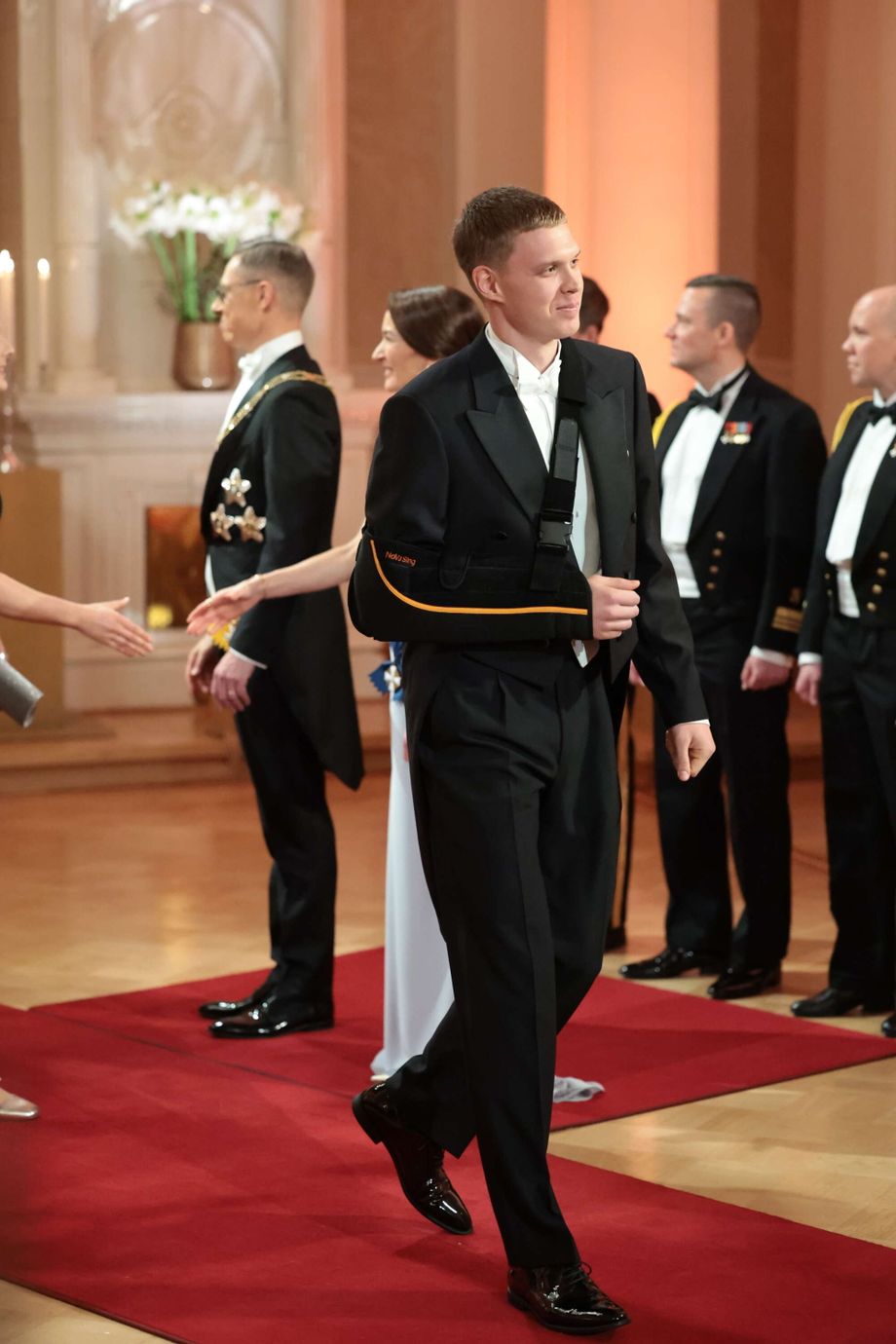 Valtonen saapui juhliin oikea käsi kantositeessä ja kätteli presidenttiparia tämän vuoksi vasemmalla kädellä.