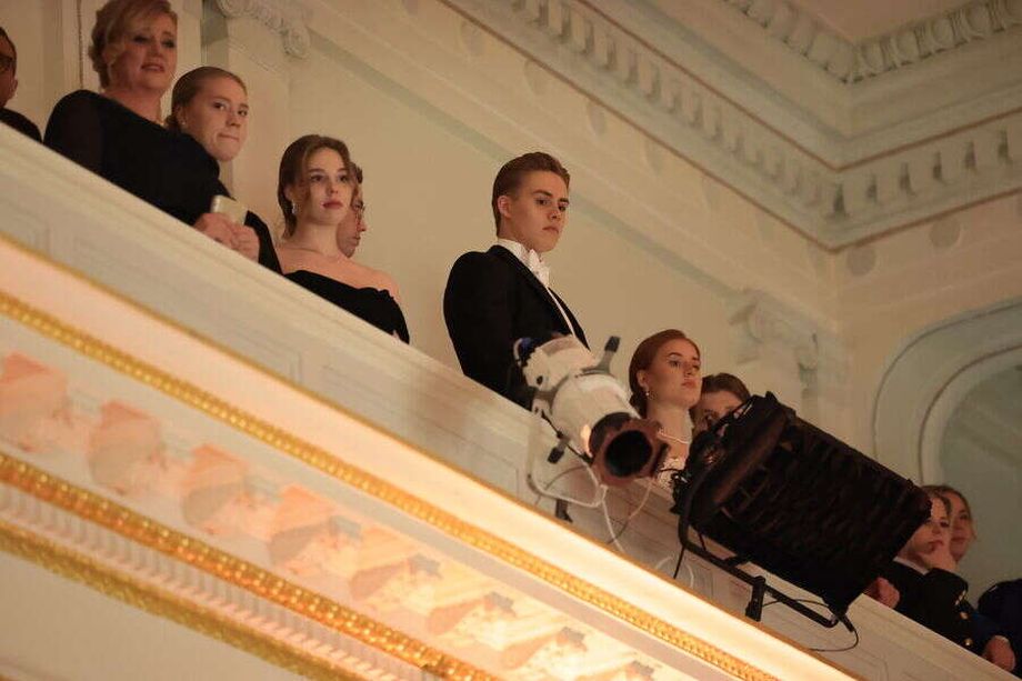 Parin lapset Emilie, 24, ja Oliver, 21, seuraavat kättelyitä Presidentinlinnan Atrium-salin parvelta.