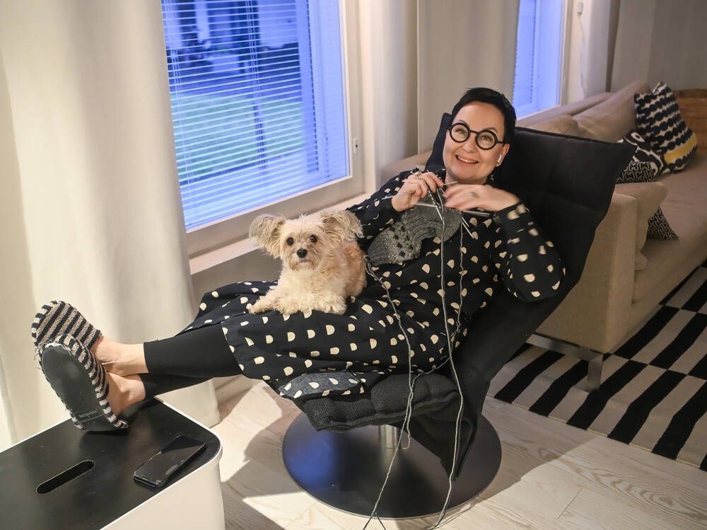 Satu Sahla-Juvankoski rentoutuu äänikirjojen parissa. Jos Sahla-Juvankoski ei ole Valo-koiran kanssa lenkillä, voi hänet löytää kutomatyön äärestä. Kuva: SSS/Kirsi-Maarit Venetpalo