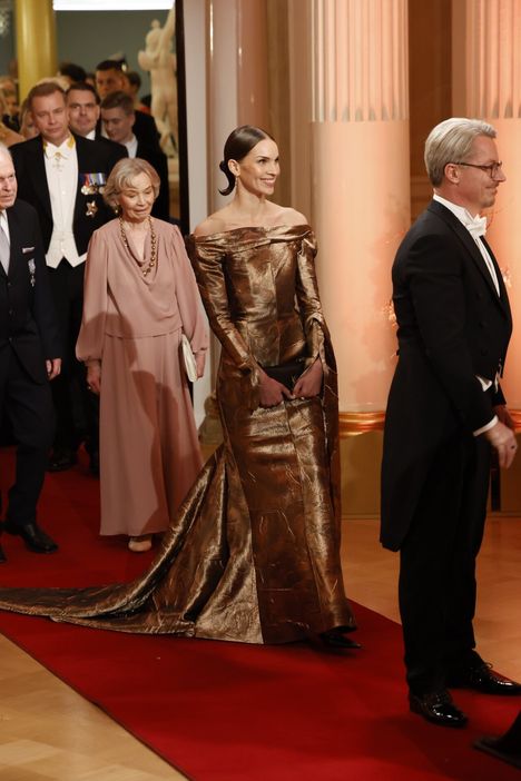 Yllään Peltosella oli näyttävä, kullan ja kuparin sävyissä säihkyvä olkaimeton iltapuku, jossa oli pitkä laahus. Iltapuvun erikoisuutena oli, että osa sen helmasta oli kiinnitetty puvun vasempaan hihaan. Kädessään hänellä oli samansävyinen laukku.