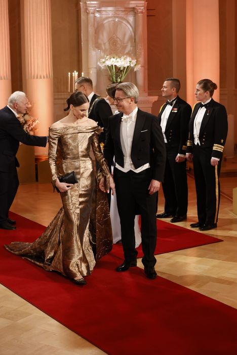 Muun muassa joogasisällöistään tunnettu somevaikuttaja Vilma Peltonen saapui Linnan juhliin yhdessä puunjalostusjätti Versowoodin toimitusjohtajan Ville Kopran seurassa.