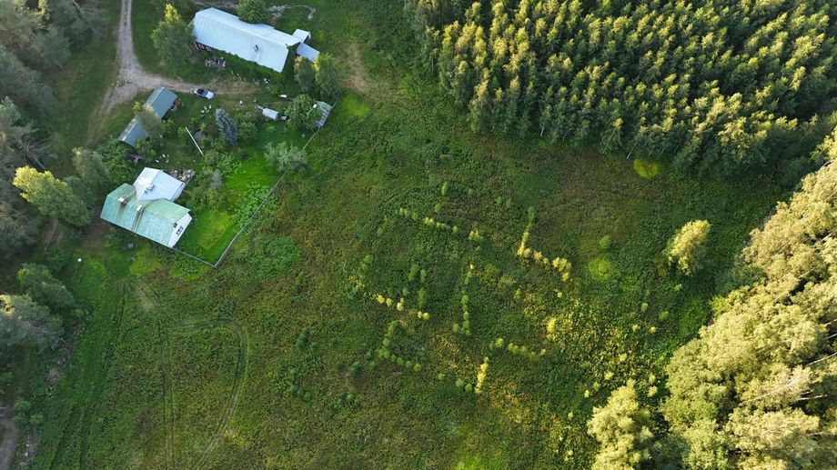 Maastosta käsin logoa on lähes mahdotonta erottaa. Roine eli viisi vuotta epätietoisuudessa. Tänä kesänä hän hankki droonin ja kävi tarkastamassa työnsä jäljen. Hän yllättyi, miten hyvin kuvio näkyi.