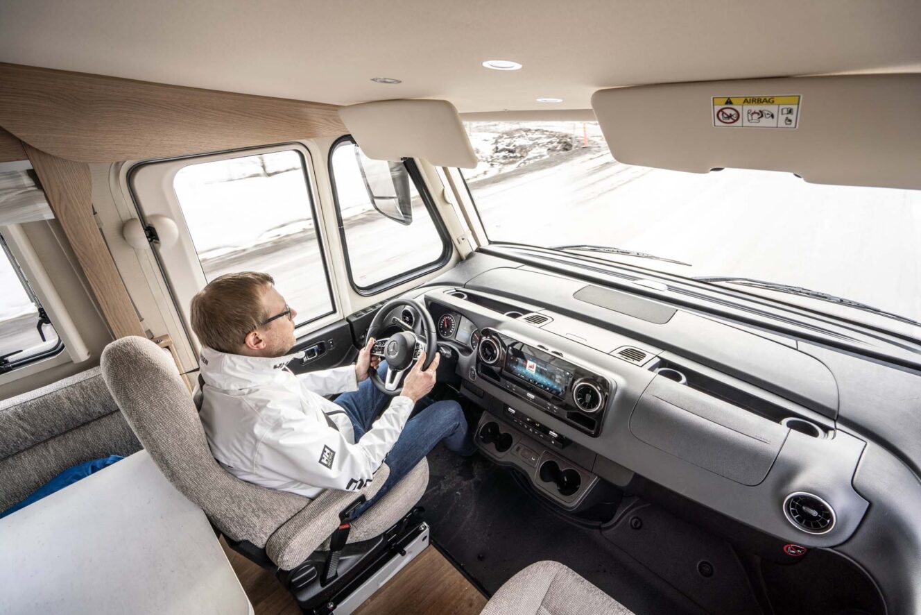 Hymer B-MC I 580, kuten mallimerkintä kuuluu, hyödyntää viime vuonna uudistuneen Mercedes-Benz Sprinterin alustaa – ja sen myötä mahdollisuutta etuvetorakenteeseen. Suurta autoa ulkoapäin katsoessa on vaikea uskoa, että se vetää etupyörillään, mutta ratkaisulla saavutetaan tehokkaampi tilankäyttö ja kevyempi rakenne takavetoiseen malliin nähden.