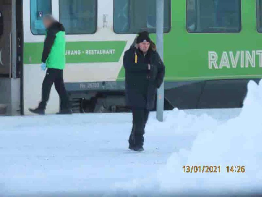 Poliisi kuvasi Lapin Jokerin poistumassa Kemin juna-asemalta jätettyään vankilomalla olleelle ystävälleen huumepaketin tammikuussa 2021. Taustalla oleva VR:n työntekijä ei liity tapaukseen. Poliisin esitutkintamateriaali