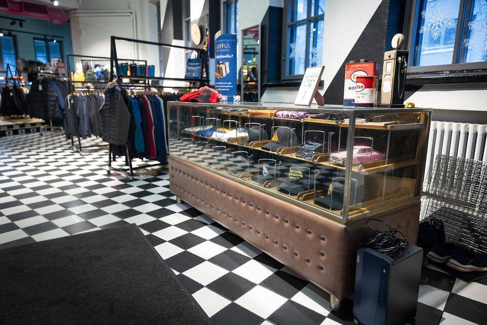 Ennen bensaa, nyt paitoja. Huoltoaseman menneisyyttä ei remontoitu umpeen, fiftarityylinen lattia on Riku Motorin ajoilta. Mirja Hussain