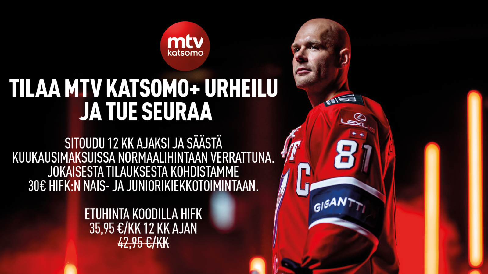 Näe kaikki Liiga-matsit suorana MTV Katsomo+ Urheilu -tilauksella! Hyödynnä MTV:n ja HIFK:n kampanja, säästä fyrkkaa ja tue seuran nais- ja juniorikiekkotoimintaa.