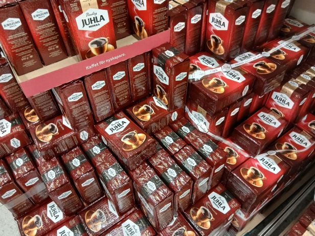 Molemmissa S-ryhmän kaupoissa useimmilla asiakkailla oli kärryissä ainakin ne kaksi Juhla Mokkaa. Jouluna ryystetään ja kuluu paljon kahvia.