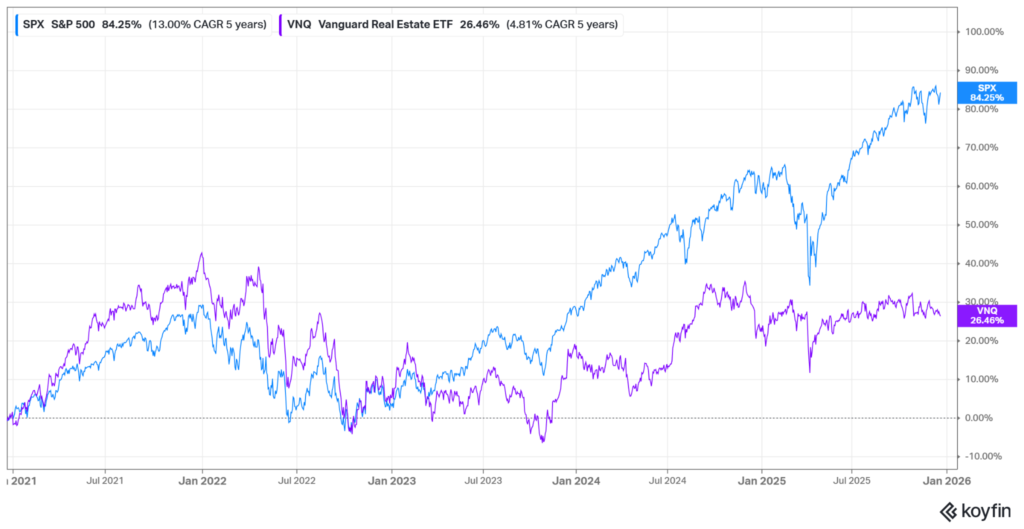 S&P 500-indeksin ja REIT-yhtiöitä seuraavan ETF:n tuottokehitys viimeisen viiden vuoden ajalta.