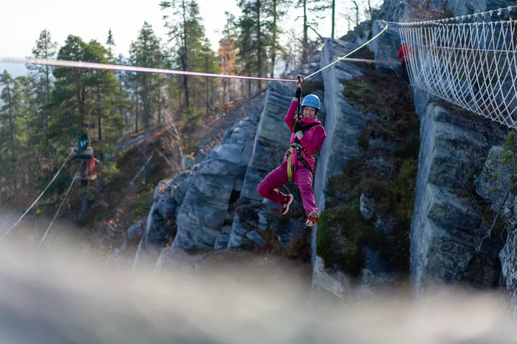 Seikkailupuistossa voi kokeilla vaijeriliukua.