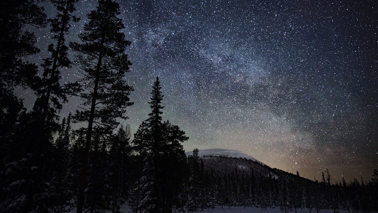 Kamera on vanginnut tähdet taivaalta Ylläksellä, vaikka laskettelukeskuksen valonkajo peittää niistä osan. Kuva: Juho Rahkonen