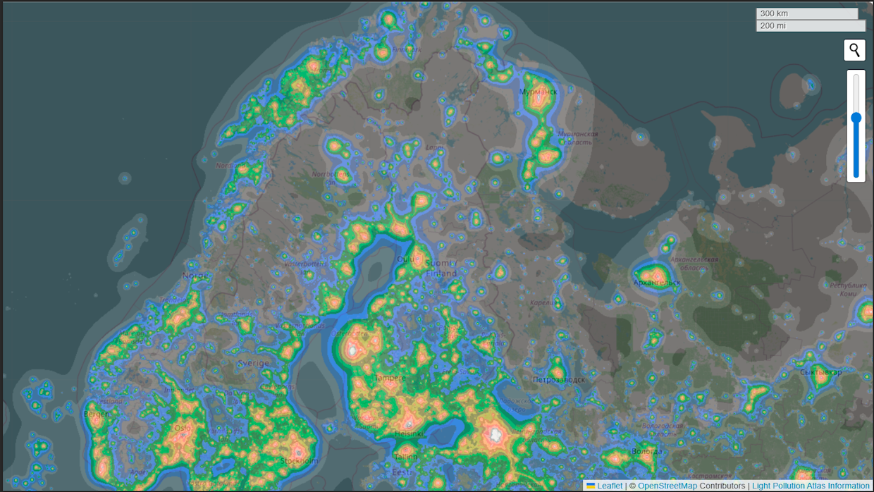 Ihmisen tuottama valo näkyy hyvin avaruuteen. Kuvassa satelliittikuvien perusteella laadittu Light Pollution Atlaksen kuva valosaasteesta Suomen yläpuolelta.