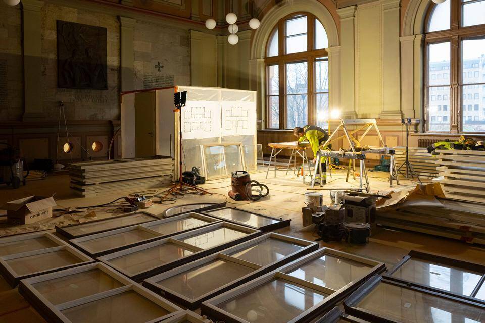 Toisen kerroksen juhlasalissa on meneillään ikkunoiden entisöinti. Vanhat ikkunat pyritään säästämään pokineen ja laseineen. Salista kunnostetaan kaupungin ykkösjuhlatilaa, kehaisee arkkitehti Ilkka Kärnä Arcadiasta.