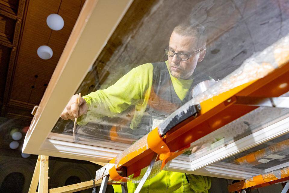 Mika Alm entisöi ikkunoita taidemuseon juhlasalissa. Varsinkin varjon puolen ikkunat ovat Almin mukaan hyvin säilyneet. Mikko Makkonen