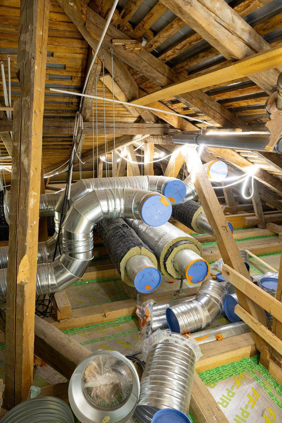 Ullakolla kiemurtelevat ilmastointiputket takaavat jatkossa rakennukseen tasaisen museaaliset olosuhteet, joista aikaisemmin vain haaveiltiin. Mikko Makkonen