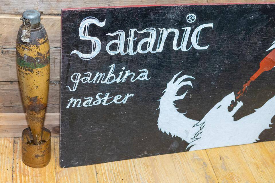 Alttarilla eli pienen kamiinan päällä on kuivunut banaani kääriytyneenä tyhjään viskipulloon. Seiniä koristavat julisteet, rikkinäiset rumpupellit ja luontoaiheiset piirrokset sekä muutama pentagrammi. Viereisessä huoneessa lämpiää sauna.