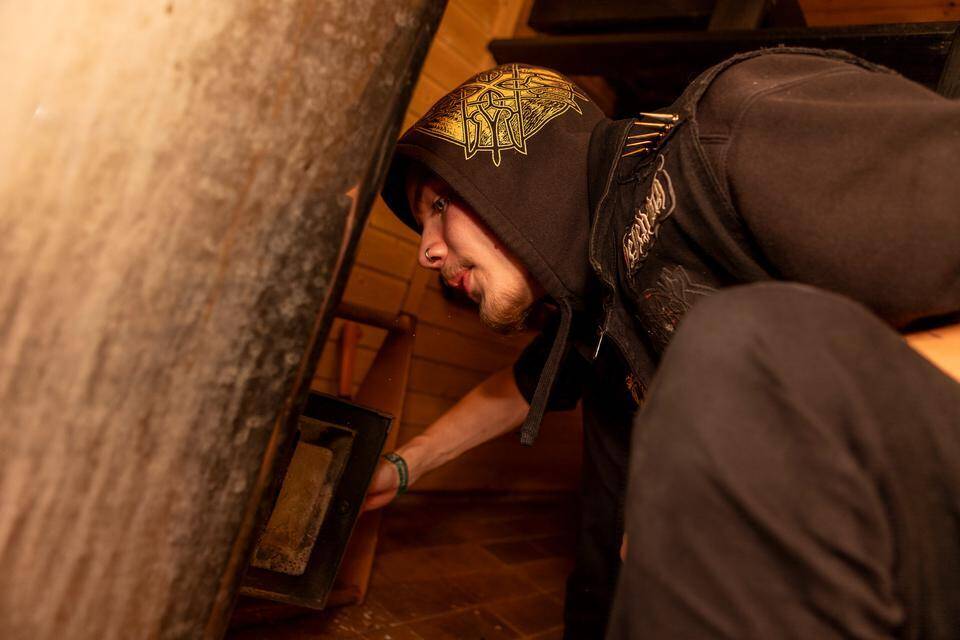 Jos viereistä saunaa ei lämmittäisi, olisi treenikämpällä liian kylmä. Niilo Karila laittamassa lisää puita saunaan. Tomi Vesaharju