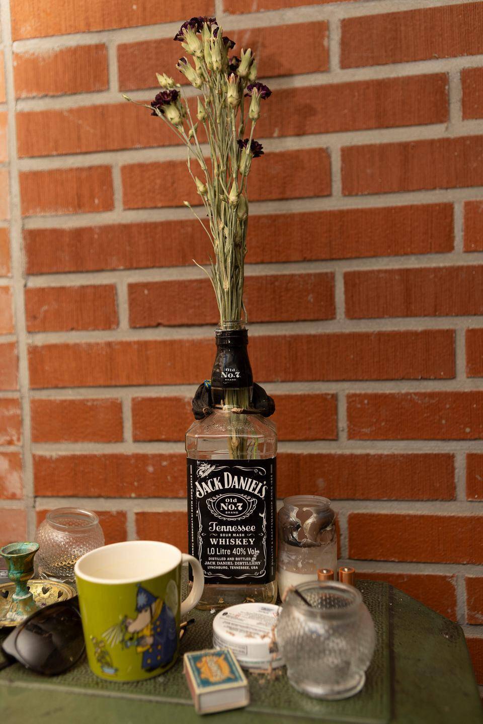 Kuvassa Lohdunsyöjän treenikämpän alttari, eli kamiina jonka päällä on viskipulloon kietoutunut vanha banaani. Tomi Vesaharju