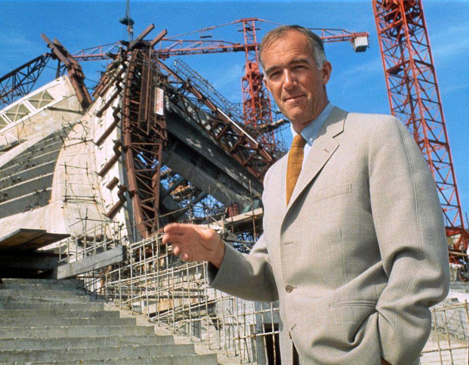 Arkkitehti Jørn Utzon Sydneyn oopperatalon rakennustyömaalla vuonna 1965. Barry Peake / AOP