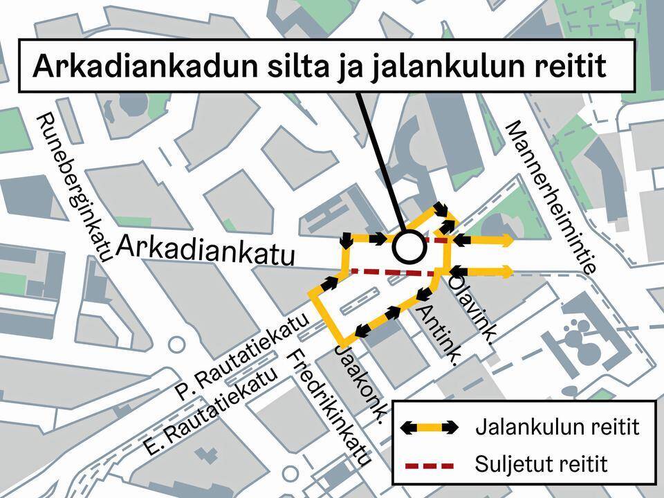 Pohjoinen Rautatiekatu muuttuu yksisuuntaiseksi Mannerheimintien suuntaan sillan kohdalla. Länteen päin kulkeva kiertoreitti kulkee Arkadiankadun ja Fredrikinkadun kautta.
