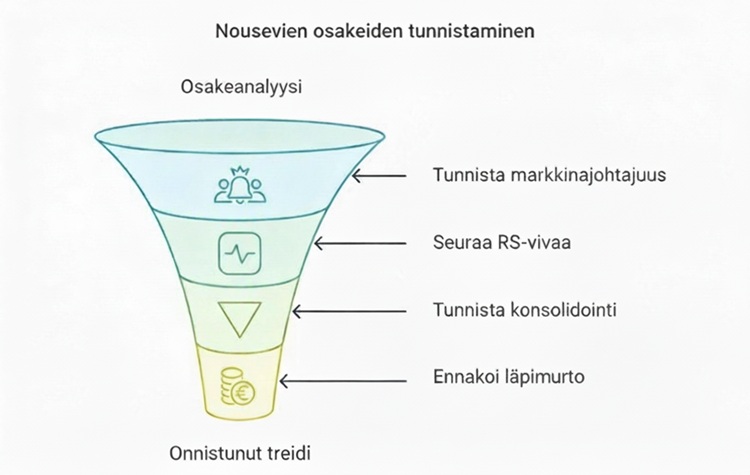 Ryanin mukaan ihanteellinen tilanne on, että suhteellisen vahvuuden viiva tekee uusia huippuja samaan aikaan, kun osakkeen hinta vielä konsolidoi. Konsolidointi tarkoittaa ajanjaksoa, jolloin kurssi liikkuu kapeahkossa vaihteluvälissä ilman selkeää nousu- tai laskutrendiä.