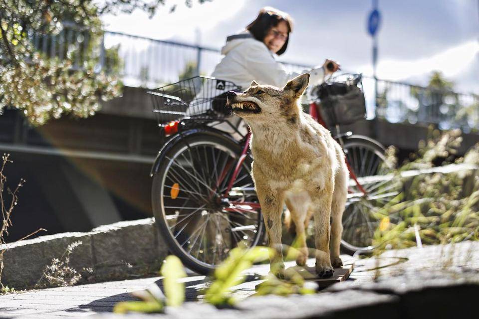 Susi herättää ihmisessä luontaista varautuneisuutta. Ohikulkija hämmästeli Forssan luontomuseolta kuvausta varten lainaan saatua täytettyä sutta Forssan keskustassa. Kuva: Lassi Puhtimäki