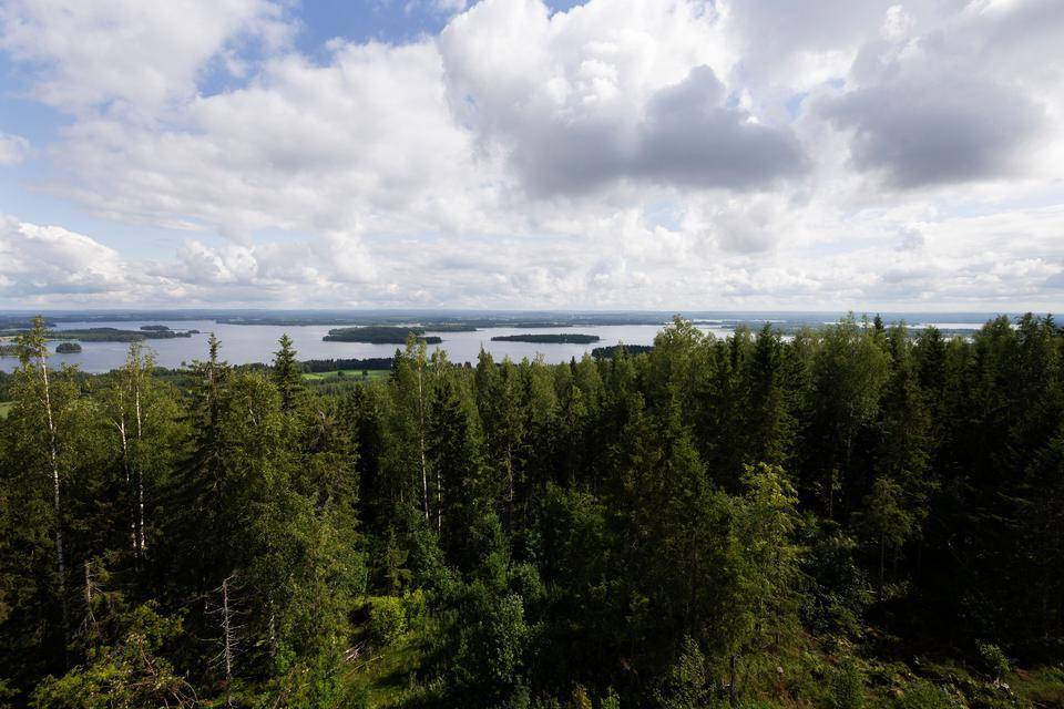 Näkymä Väisälänmäen näkötornista kohti Rannan-Puurulaa. Maalauksessa kuvattua kaskea talonväki poltti Väisälänmäen rinteessä noin puolen kilometrin päässä tilasta sekä läheisessä Kittolanniemessä. Matias Honkamaa