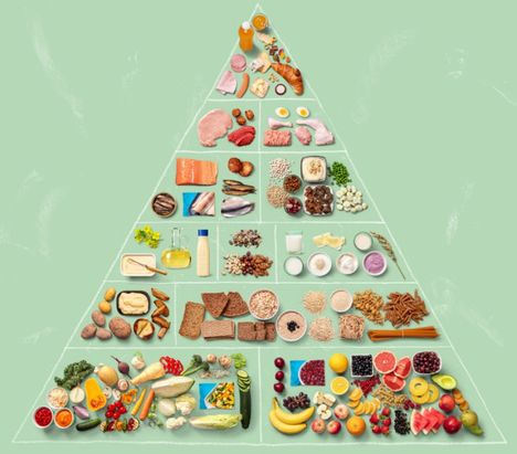 Esimerkiksi perinteisen amerikkalaisen ruokapyramidin ja myös suomalaisten suositusten mukaan eniten tulisi syödä kasviksia ja hedelmiä, sitten hiilihydraattien lähteitä kuten viljoja, perunaa ja riisiä ja niitä vähemmän erilaisia rasvojen ja proteiinien lähteitä.