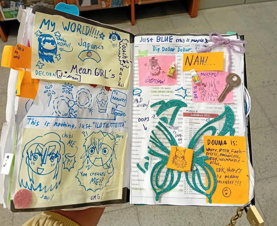 Auroora Similän leikekirja on kiinnitetty ketjulla pöytään, jottei se katoa.