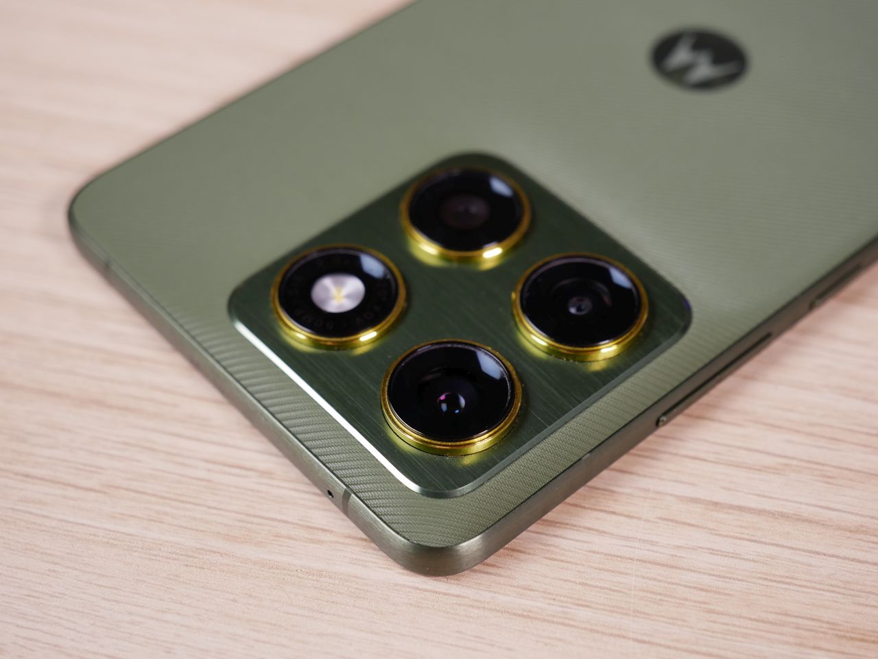 Takakuoren pinta on silikonia, johon on viimeistelty valmistajan mukaan nylon-tekstiiliä muistuttava pintakuviointi. Pinta on hieman kumimaisen pehmeä ja kädessä varsin pitävän tuntuinen. Toisin kuin jotkut tuotekuvat antavat ymmärtää, tekstiilille se ei kuitenkaan varsinaisesti tunnu. Värivaihtoehdot Motorola on napannut tuttuun tapaan Pantonen valikoimasta ja testikappaleemme vihreän värin nimi oli Bronze Green. Muita värivaihtoehtoja ovat vihertävänharmaa Lily Pad sekä siniharmaa Gadget Gray. Lisäksi väritystä on piristetty kameroiden korosterenkaissa sekä kyljen toimintonäppäimessä käytetyllä korostevärillä, joka oli testikappaleessamme metallinkeltainen.