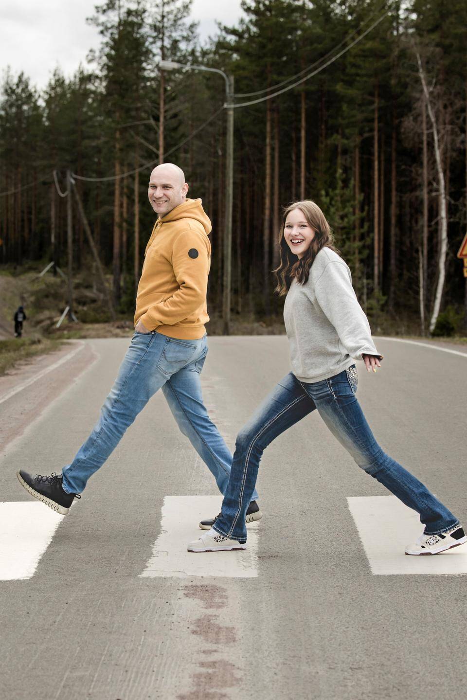 Janne Ala-Krekola ja hänen tyttärensä Veera Ala-Krekola, 16, ylittämässä kylänraittia Aitomäessä.