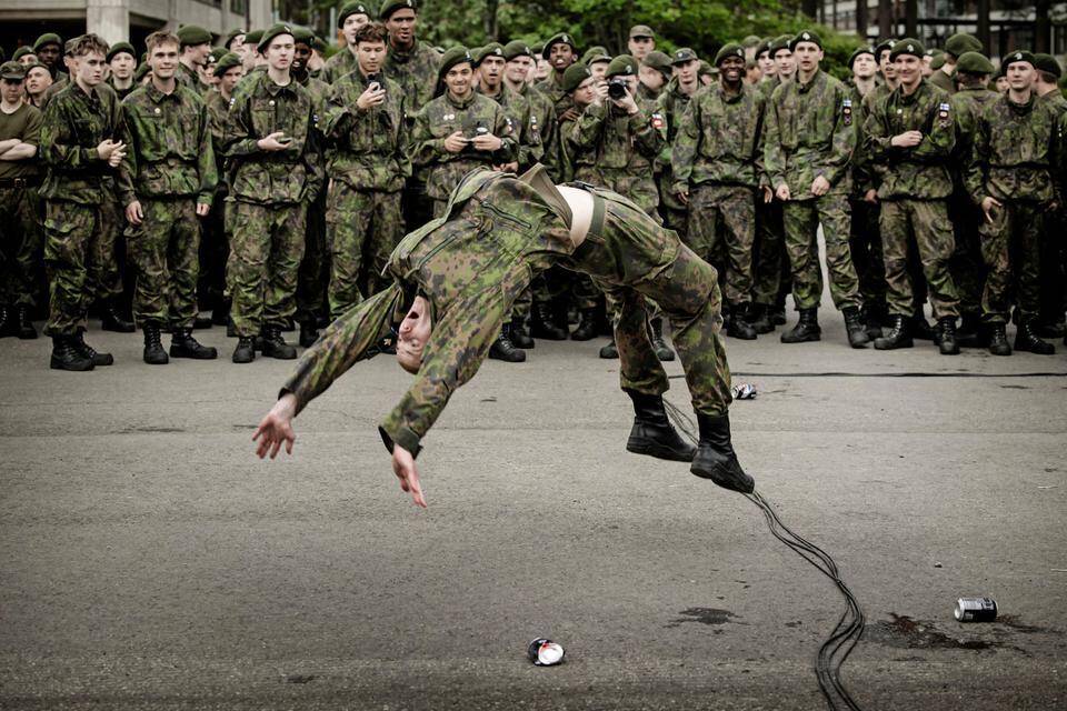 Karjalan prikaatin kotiuttamisjuhlassa Otto Lundberg heitti voltin juhlinnan tuoksinnassa.