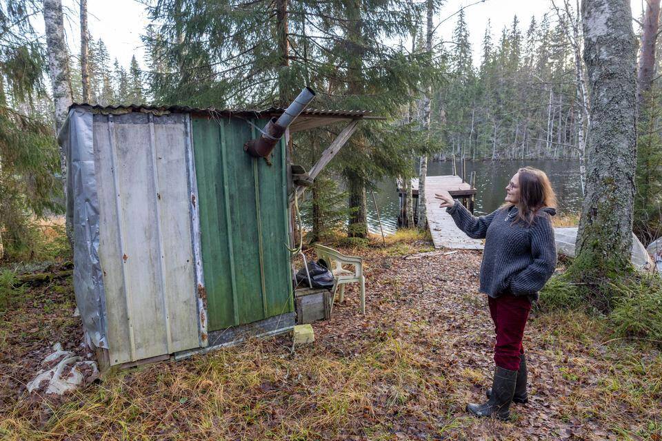 Lammen rannalla oleva sauna on rakennettu löytötavarasta. Timo Mustalampi