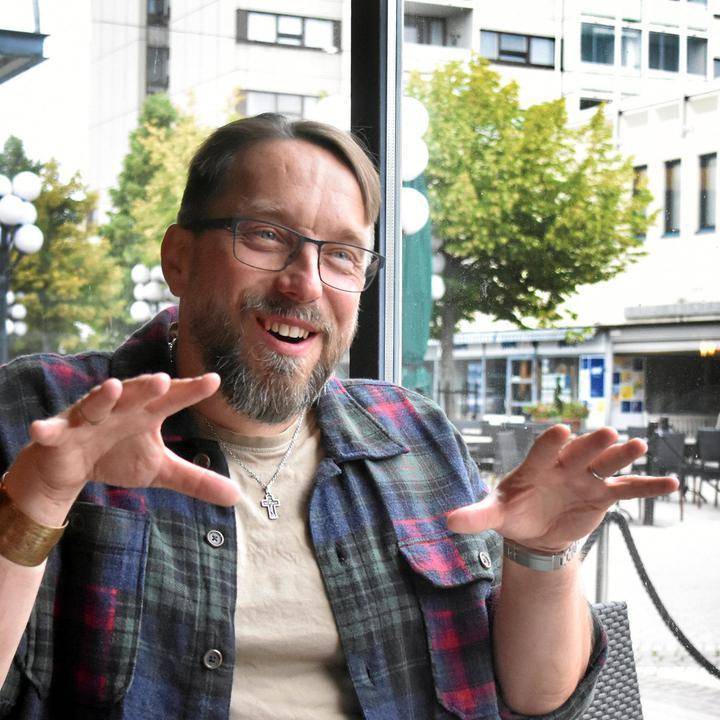 Entinen näyttelijä ja pappi, nykyinen kirjailija ja konsultti Johannes Lahtela, 50 istuu Helsingin kauppatorilla Allas Pool kahviossa.
