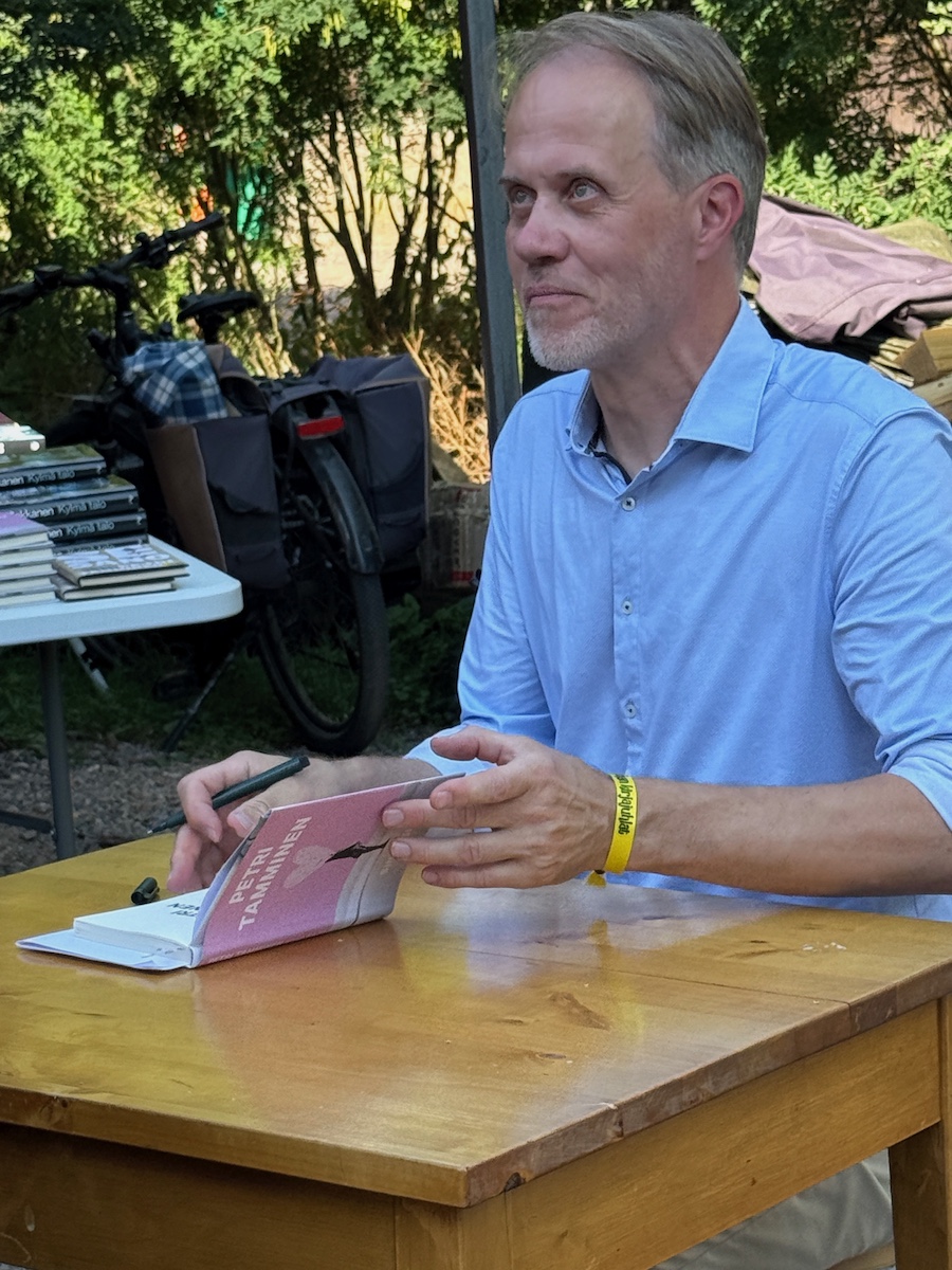 Olen käynyt vuosia Helsingin Kirjamessuilla, mutta tänä kesänä kävin ensimmäistä kertaa kahdessa kesäisessä kirjatapahtumassa eli Sastamalassa Vanhan kirjallisuuden päivillä ja Ruovedellä Vinhan Kirjajuhlilla. Mieltä lämmitti, kun kummassakin tapahtumassa oli runsaasti innokkaita kirjaharrastajia ja hyvä tunnelma. Yksittäinen mieleen jäänyt kohokohta oli Ruovedellä kirjailija Petri Tammisen haastattelu. Tamminen kertoi avoimesti ja sympaattisesti kirjansa ”Sinua sinua” taustasta ja kirjoitustyöstä – ja etenkin siitä, miltä tuntui palata vuosikymmenien takaiseen rakkautensa ja pettymystensä tarinaan. Tavanomaista haastattelua monta astetta syvällisempi ja aidompikin kirjailijahaastattelu.”