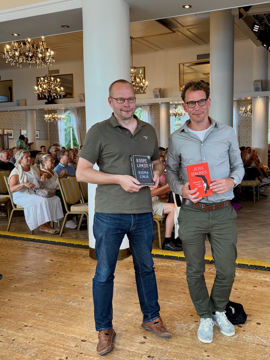 Lavanumeroiden tauoilla tuli keskusteltua eri kirjailijoiden kanssa. Markus Nummi oli kertomassa Käräjät-kirjastaan. Se on niin inspiroivaa, kun on lukenut kirjan ja silti kirjailijaa jo x:n kerran kuunnellessaan saa vieläkin uutta kulmaa teokseen. Jututin myös Kaamos-esikoisdekkarin julkaissutta Joel Kangasta, joka kertoi, että Mikkal Moilasesta kertovan toisen osan kirjoittaminen etenee aikataulussa.