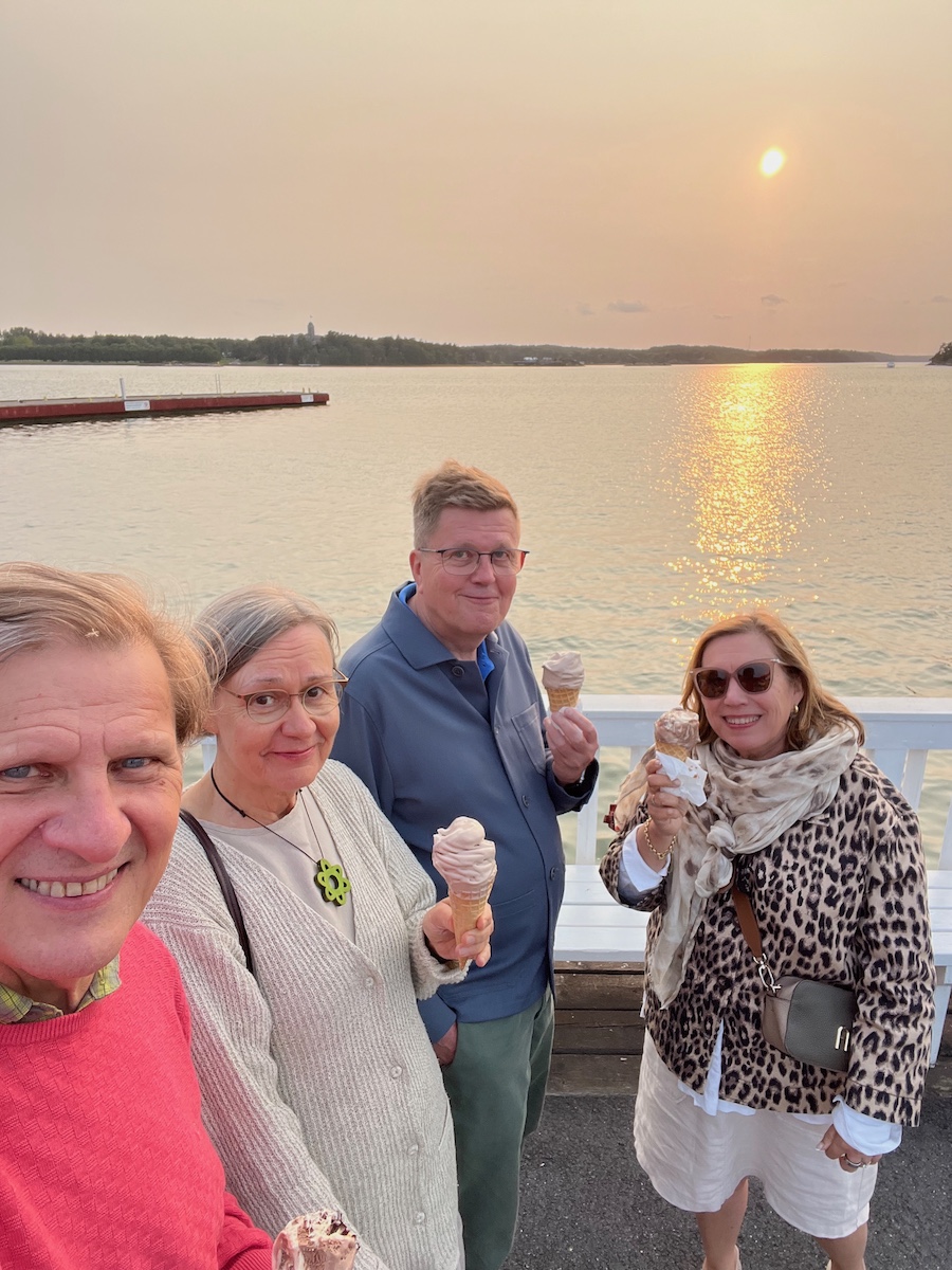 Naantali on kaunis kesäkaupunki. Presidentti Alex Stubb oli taustalla näkyvässä Kultarannassa ja uutisten mukaan osallistui kirjajuhlien aikaan eurooppalaisten johtajien ja Trumpin kanssa puhelinneuvotteluihin. Me vietimme iltaa Turussa asuvien Päivi ja Jussi Jääsaaren kanssa. Päivi on Kirsin Book Clubin jäsen, olemme tunteneet 10-vuotiaasta asti.