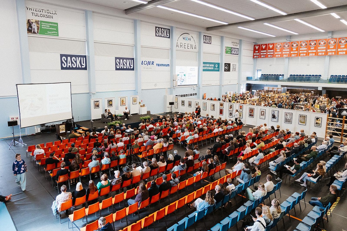 Tapahtuma järjestettiin Vexve Areenalla, joka on paikallisen ylpeyden, lentopallojoukkue VaLePan kotihalli. Suomen mestaruus -plakaatit roikkuivat takaseinällä, kirjamyyntipuolen yllä. Jos tarkkaan katsoo, olen Minna Väisälän ja Martti Raninin kanssa eturivissä kuuntelemassa Juha Kauppista ja Anni Kytömäkeä. Kuva Henniina Visuals – Photography