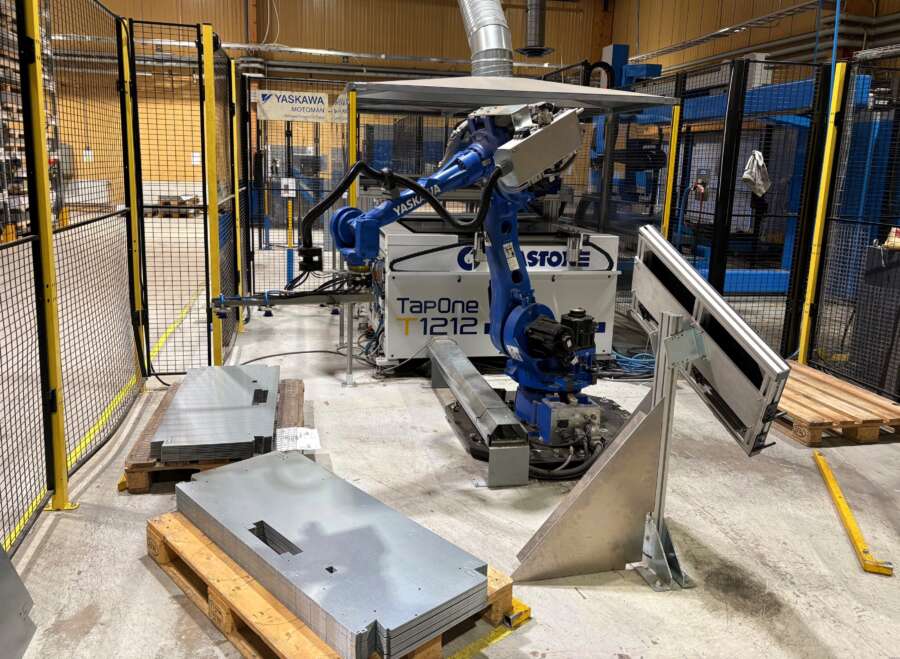 Segerin tehtaan puolella on useita robotteja, jotka tekevät toistuvia ja yksinkertaisia töitä. Tässä kone tekee metallikappaleisiin kierteitä.