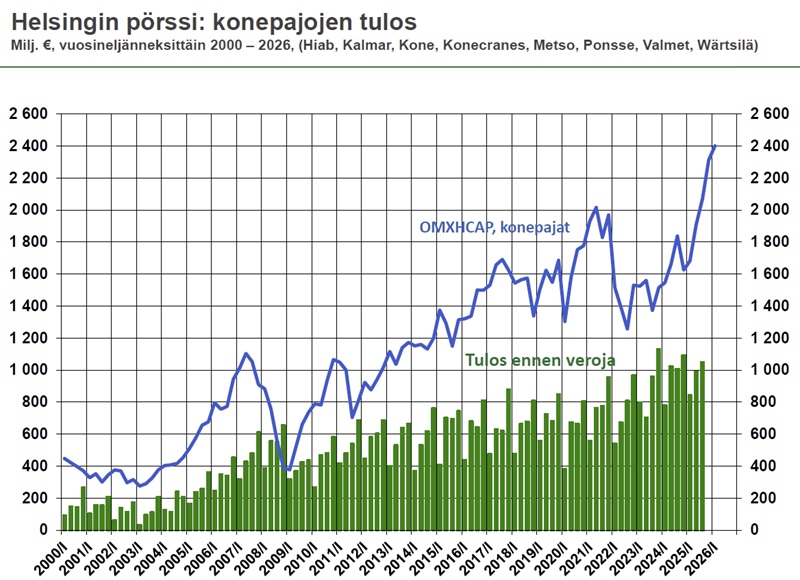 Konepajojen uusien tilausten uskotaan kuitenkin kasvavan vuoden 2026 aikana selvästi, kun teollisuuden investoinnit vauhdittuvat erityisesti euroalueella. Vuonna 2025 Metson, Konecranesin ja Wärtsilän kurssikehitykset ylittävät roimasti koko pörssin sinänsä hyvän kurssinousun.