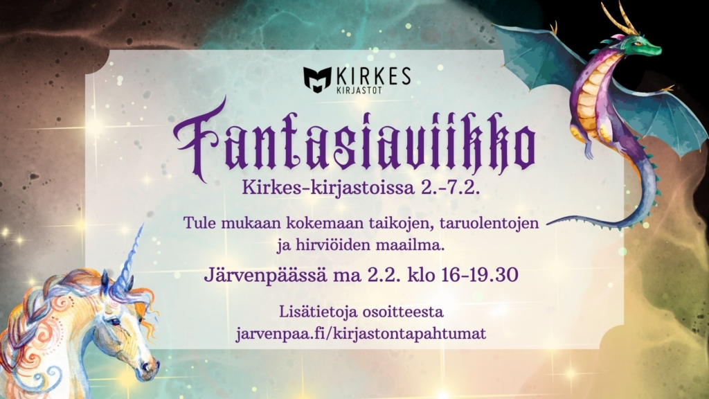 Kirkes-kirjastoissa vietetään taas fantasiaviikkoa 2.2.–7.2. Tule mukaan kokemaan taikojen, taruolentojen ja hirviöiden maailma. Tapahtumia järjestetään Kirkes-kirjastossa eri päivinä.